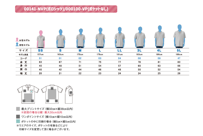 | サイズ | 00100-VP (ポケット付き):8サイズ SS~LL 3L~5L 00141-NVP(ポケット無し):8サイズ SS~LL 3L~5L |