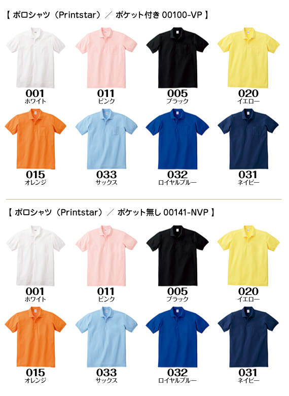 | カラー | 全8色 ※00100-VP(ポケット付き)、00141-NVP(ポケット無し)共通 |